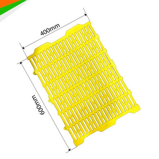 Tấm có nhiều kích thước chuẩn như 60x120 cm, 50x100 cm..., phù hợp với đa dạng khung chuồng. Thiết kế bề mặt có lỗ thoát giúp phân và nước tiểu rơi xuống nhanh chóng, hạn chế đọng ẩm gây trơn trượt.